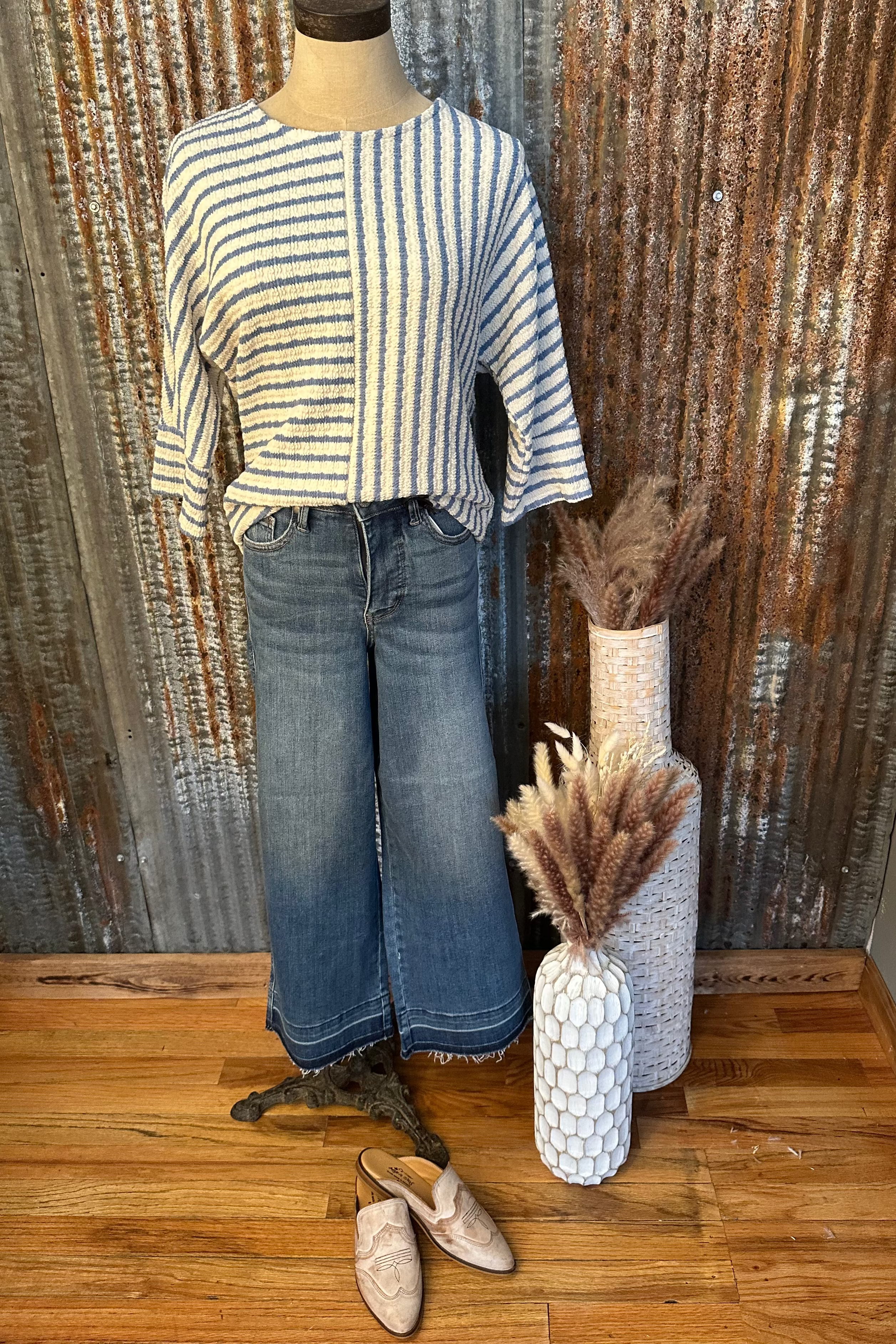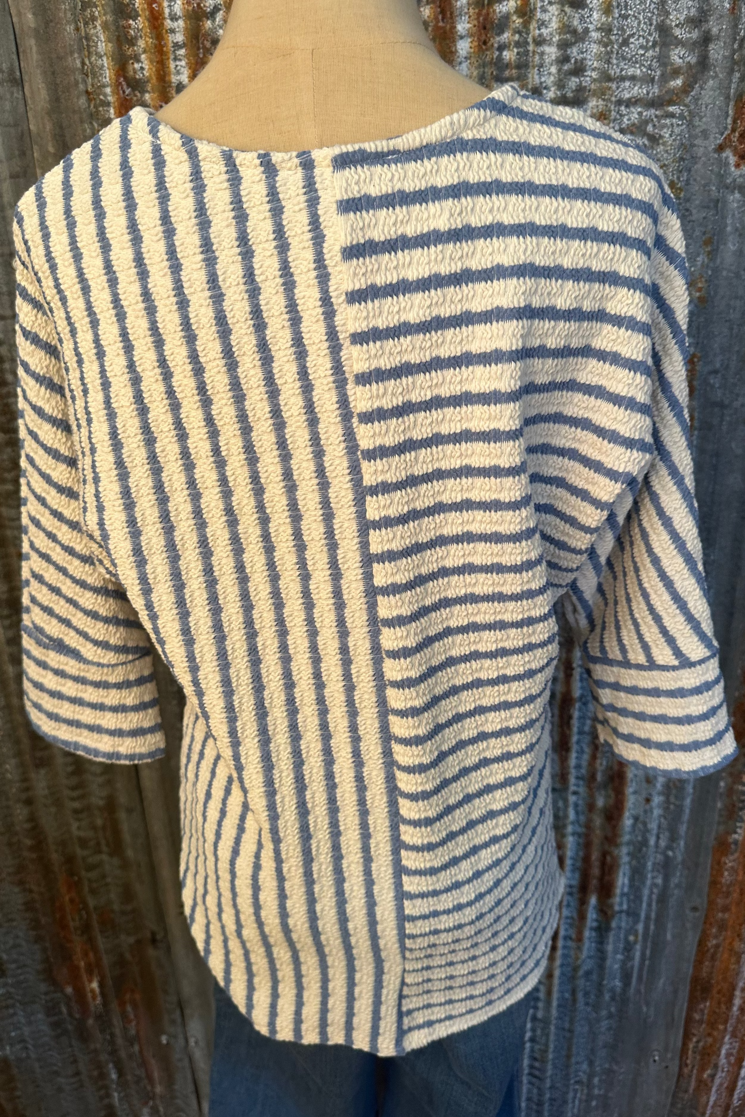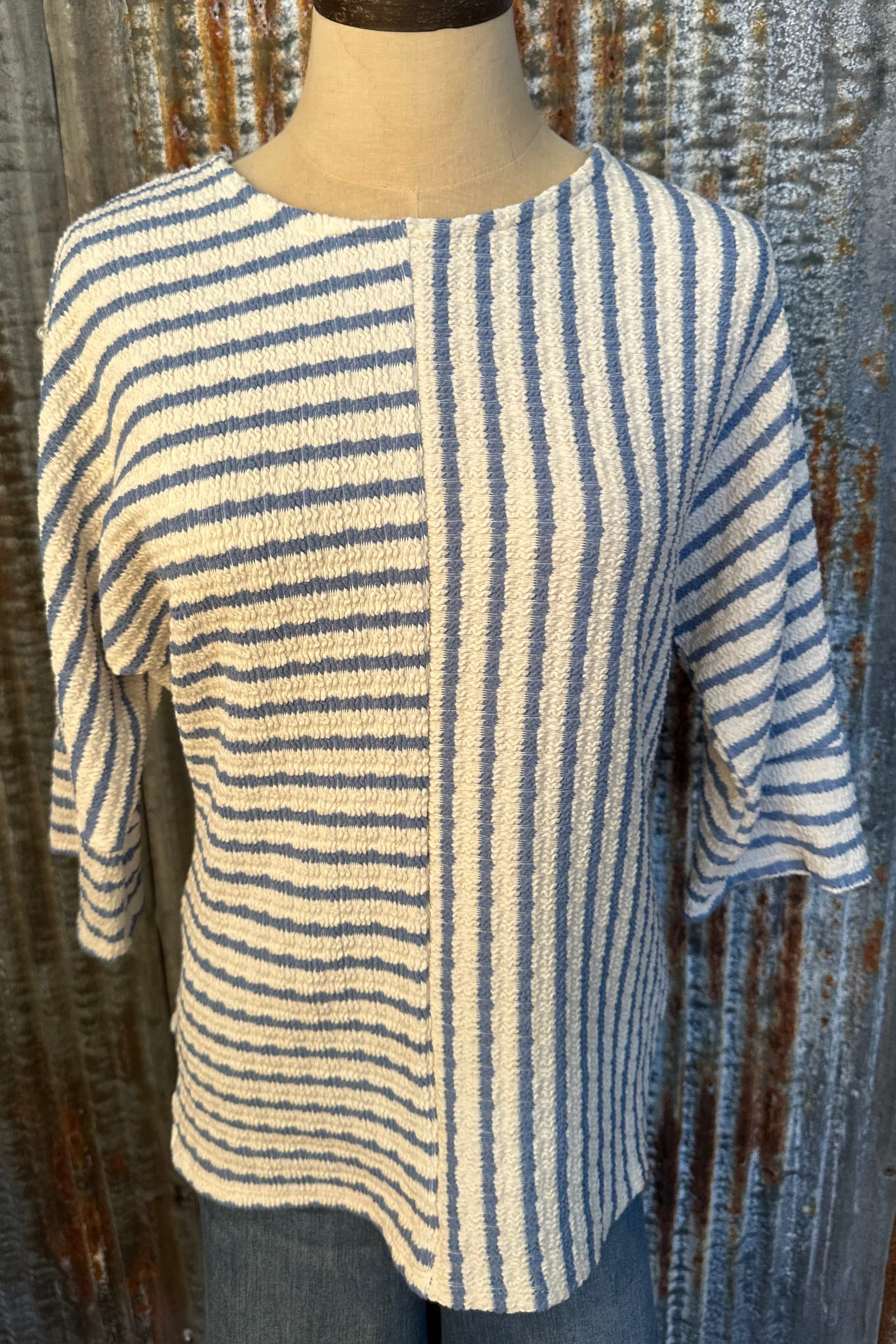 A fresh take on a classic stripe—this soft knit top features a unique mixed-direction stripe design that adds effortless style to your everyday look. With its relaxed fit and slightly cropped length, it pairs perfectly with high-waisted denim for an easy, put-together outfit.