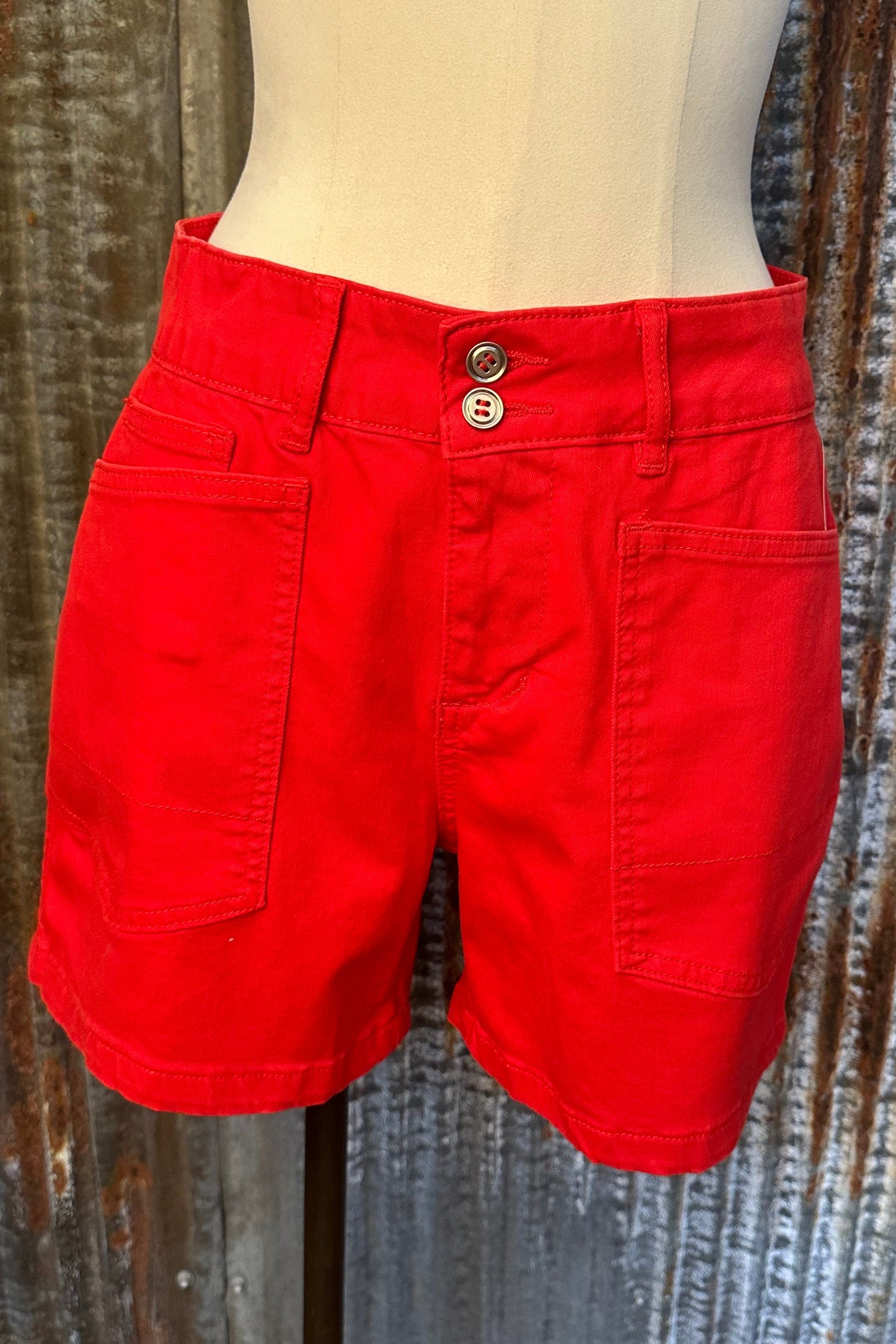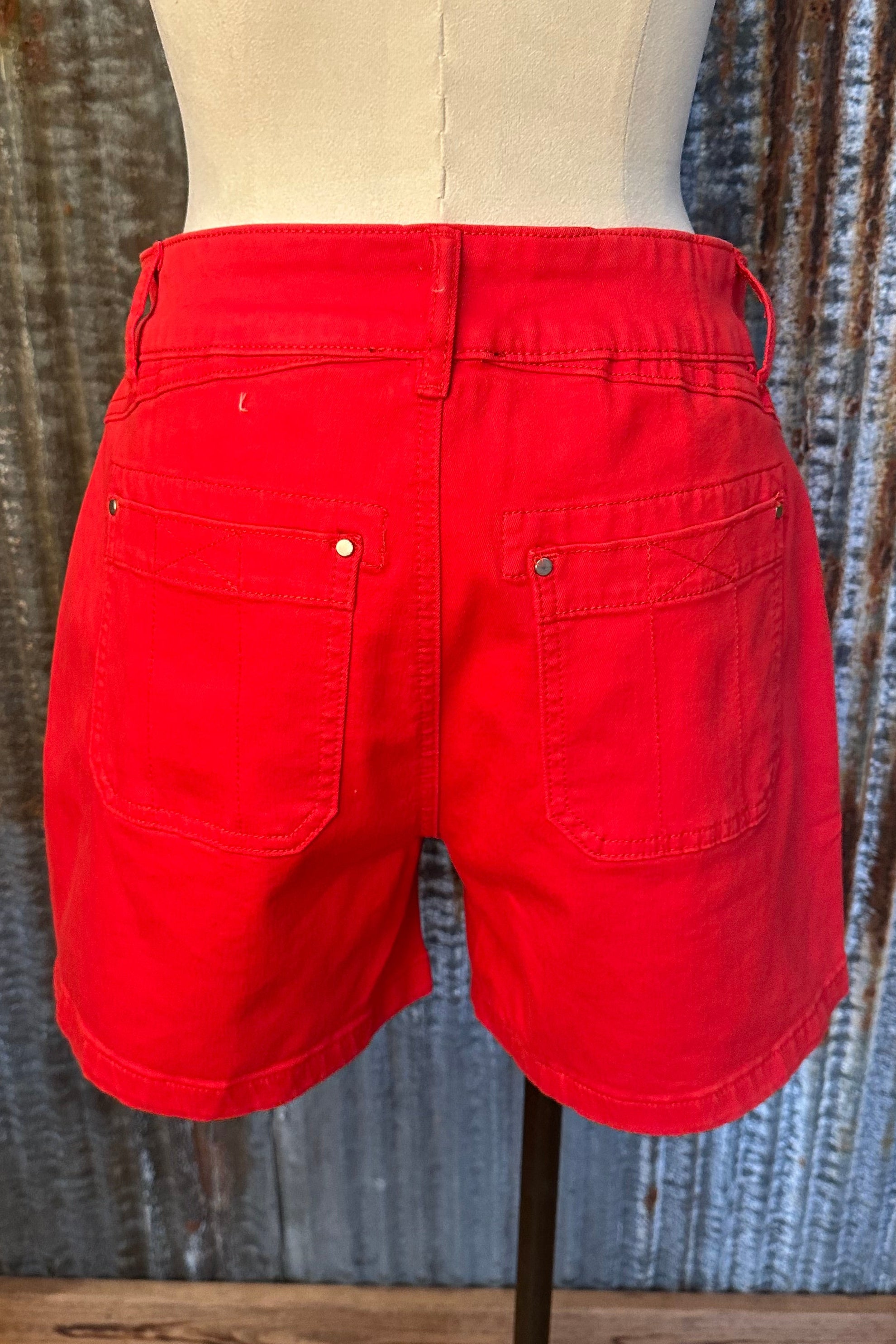 Make a statement in the Cherry Pop High-Rise Shorts. These vibrant red shorts feature a flattering high-rise fit with front patch pockets for a trendy, utility-inspired look. The structured yet comfortable fabric makes them perfect for all-day wear, while the bold color instantly elevates any outfit. Style them with a graphic tee or knit top for an effortlessly fun, summer-ready vibe.