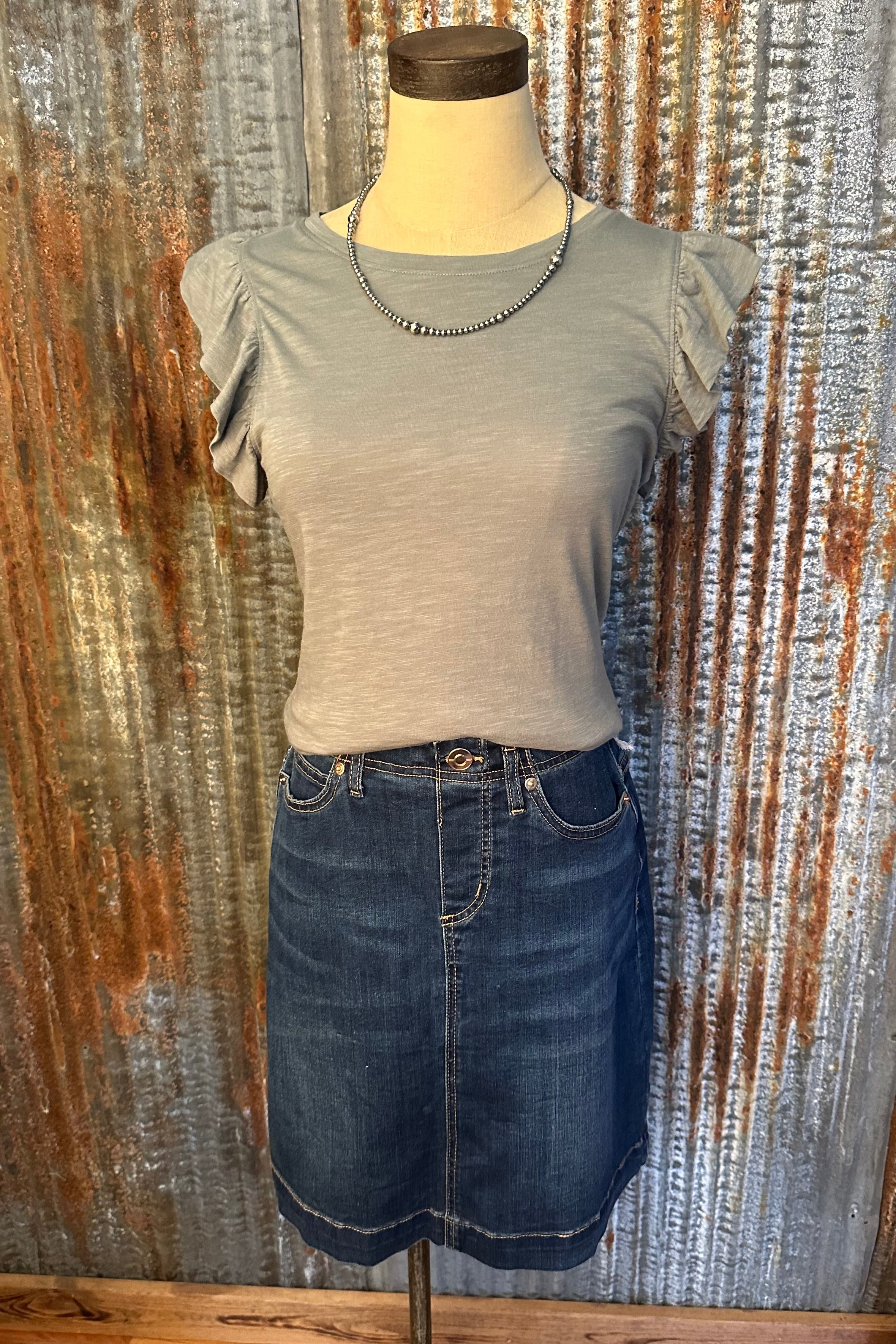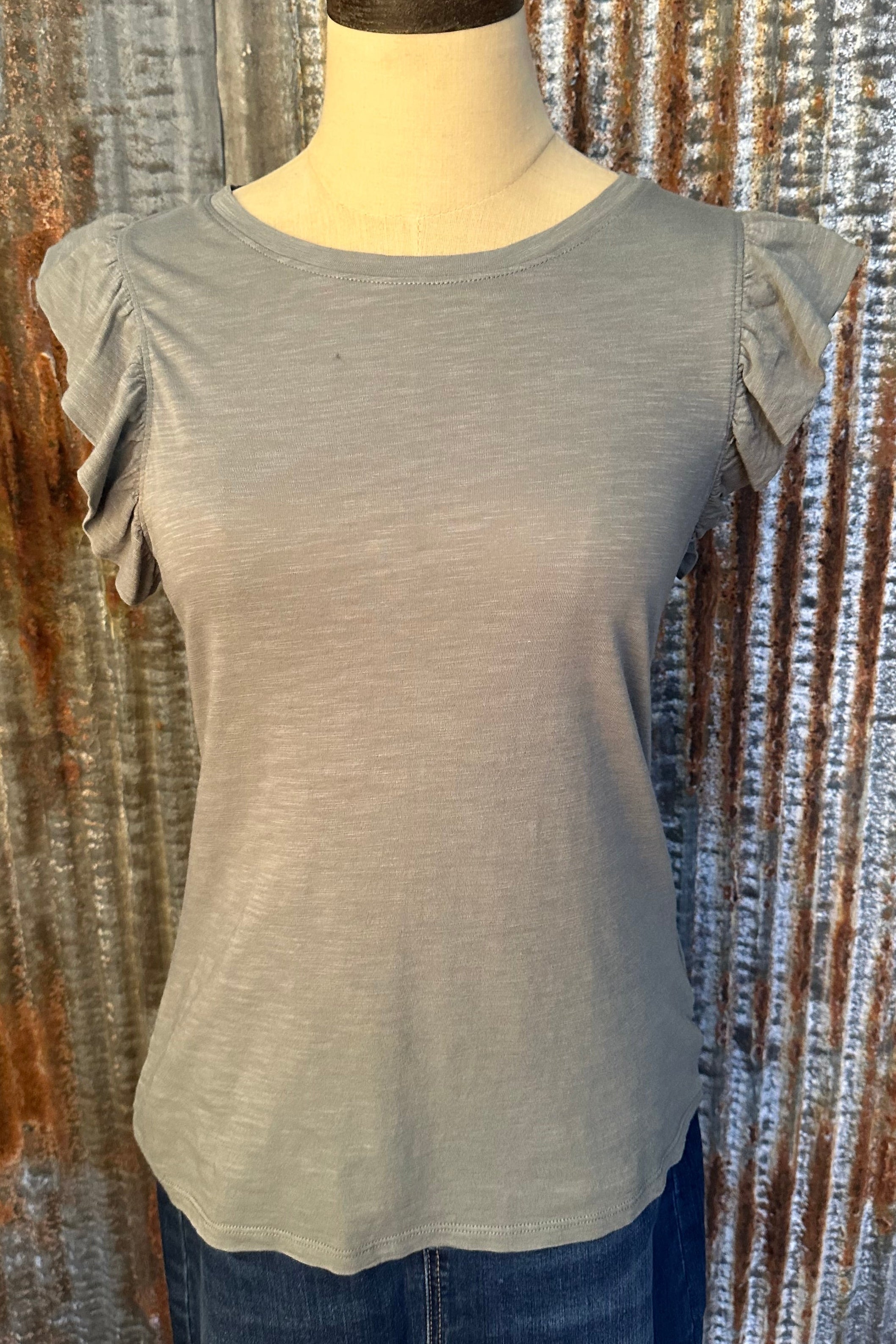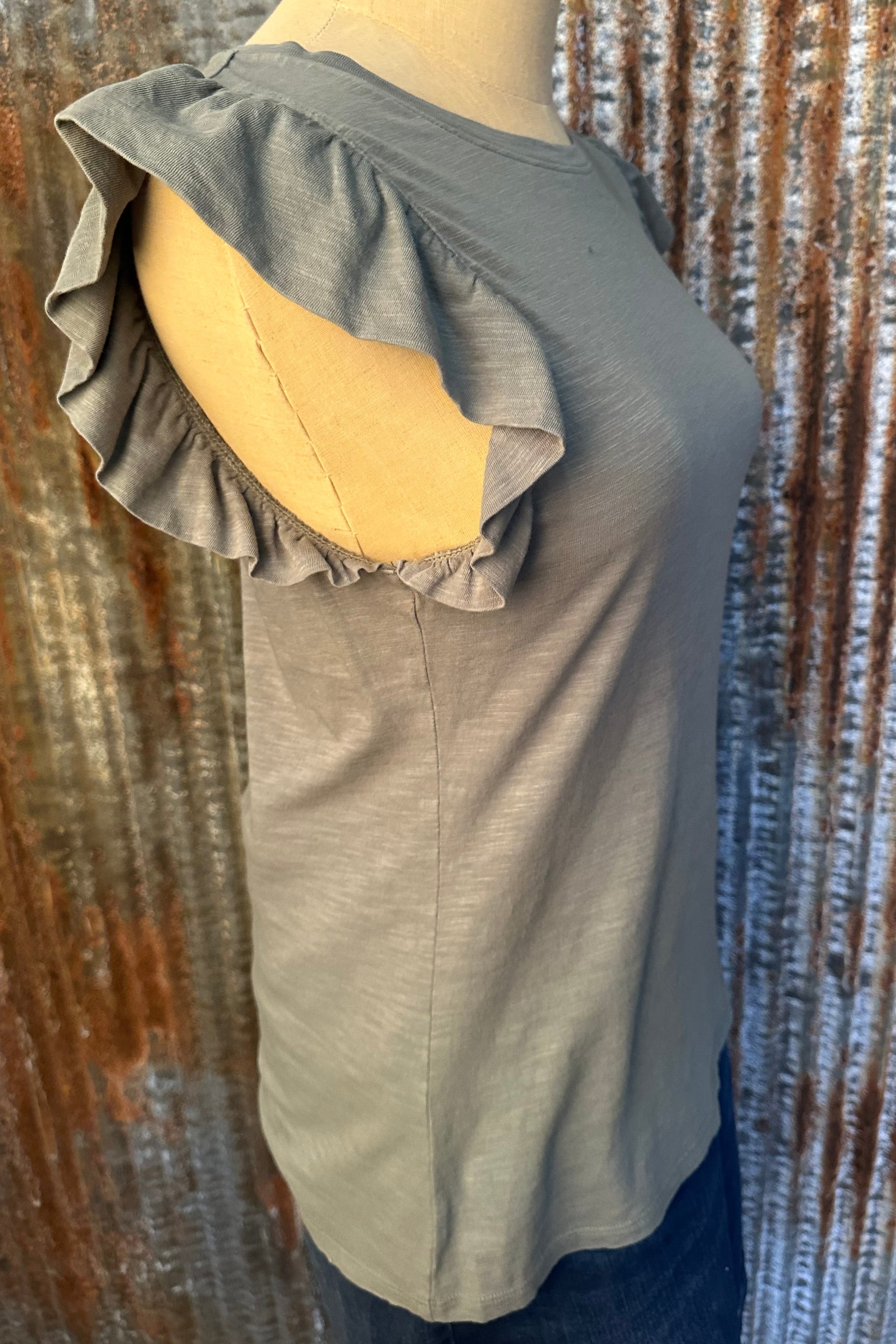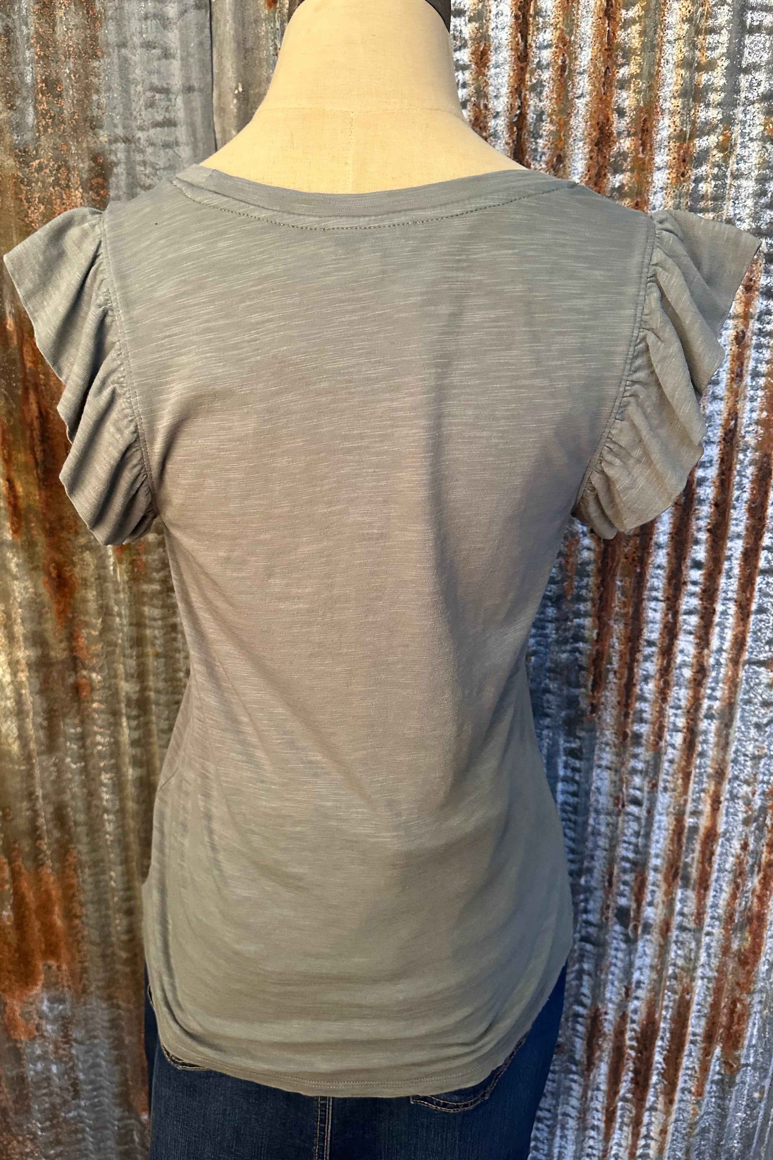 The Dusty Sage Ruffle Sleeve Top is your new go-to for effortless everyday style. Made from a soft, lightweight fabric, this top features delicate flutter sleeves that add just the right amount of feminine detail. The relaxed yet flattering fit makes it perfect for tucking into denim or wearing loose for a casual, laid-back look. Easy to dress up or down, this is a staple piece your closet needs.