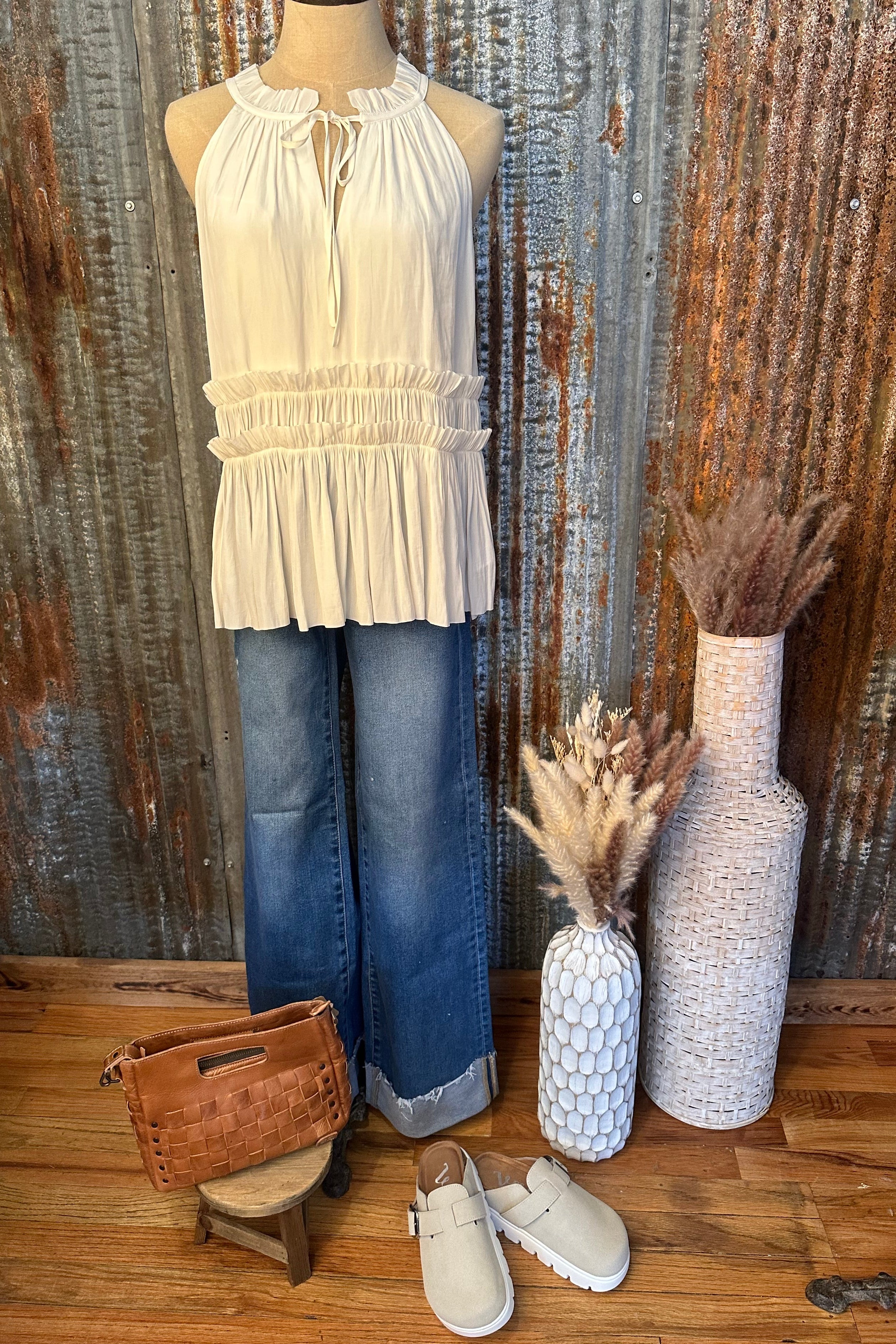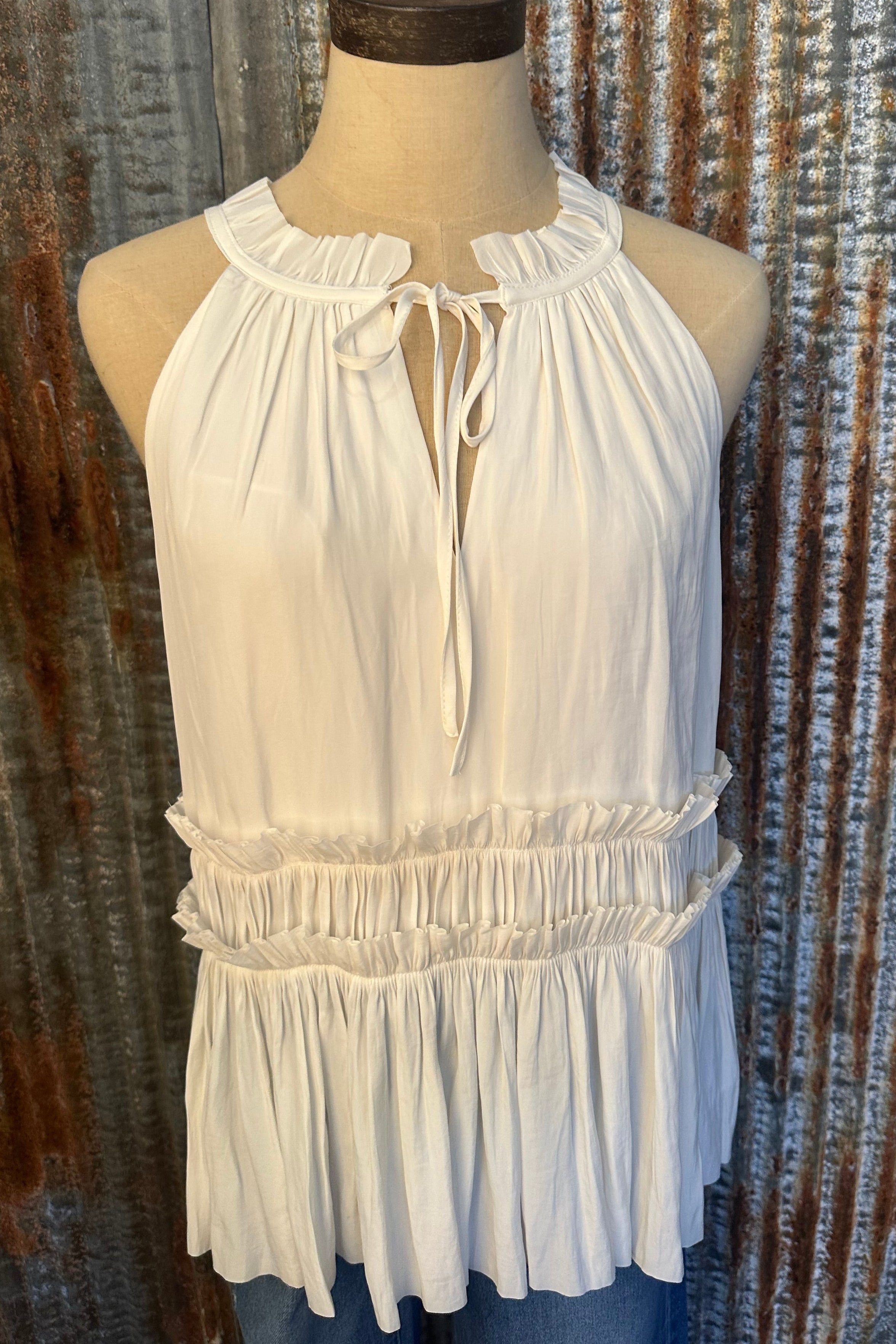 The Ivory Breeze Peplum Tank is the perfect mix of feminine and effortless. Designed with a flowy, lightweight fabric, this top features a flattering gathered neckline with a delicate tie detail and a smocked waist that creates a soft peplum silhouette. The relaxed fit and airy feel make it perfect for warm days, while the elegant design easily dresses up any look. Pair it with denim for an easy, elevated outfit.
